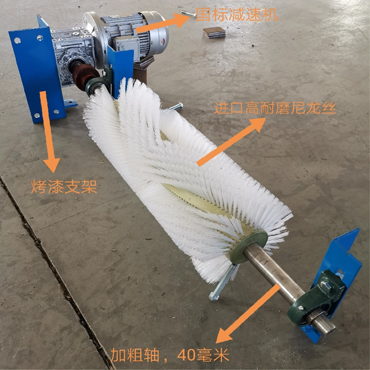 核心组成:电机 + 减速机 + 尼龙毛刷辊 + 调节架 + 轴承座 + 联轴器